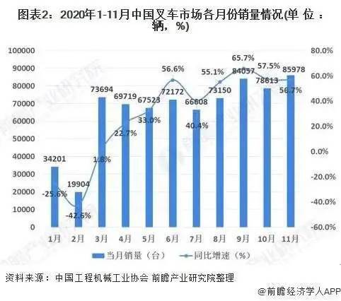 2020年受益于國內(nèi)新冠疫情得到迅速控制,國內(nèi)制造業(yè)、物流業(yè)的快速恢復(fù),叉車市場需求快速增長。2020年1-11月份的累計銷量達(dá)到72.56萬輛,與2019年同期相比增長30.3%。