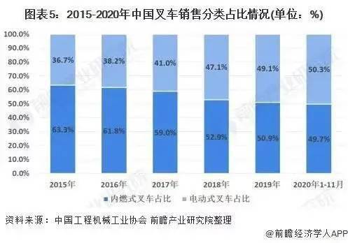 2020年1-11月份的累計銷量達(dá)到72.56萬輛,與2019年同期相比增長30.3%,其中電動式叉車銷量占比達(dá)到50.3%,比2019年增長1.2個百分點,主要是受環(huán)保要求和室內(nèi)作業(yè)環(huán)境要求的驅(qū)動,電動叉車需求持續(xù)增長。